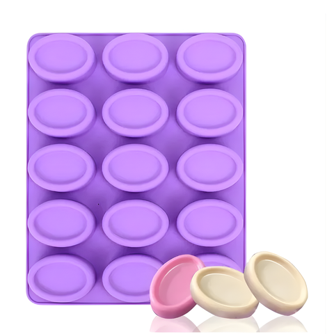 Molde de silicón con 15 cavidades para fabricar jabones ovalados.